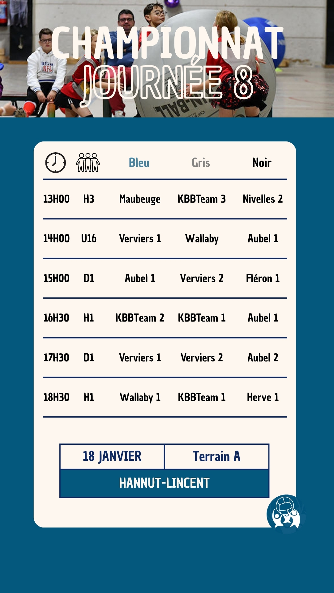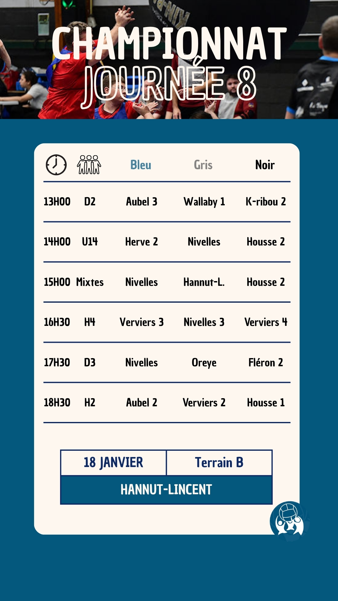La huitième journée du championnat national de la saison 2025-2026 aura lieu le 18 janvier 2026 à Hannt-Lincent (hall omnisport à confirmer). Le club de Hannut-Lincent vous accueillera pour une journée 100% Kin-Ball comptant pour le championnat national 2025-2026.
