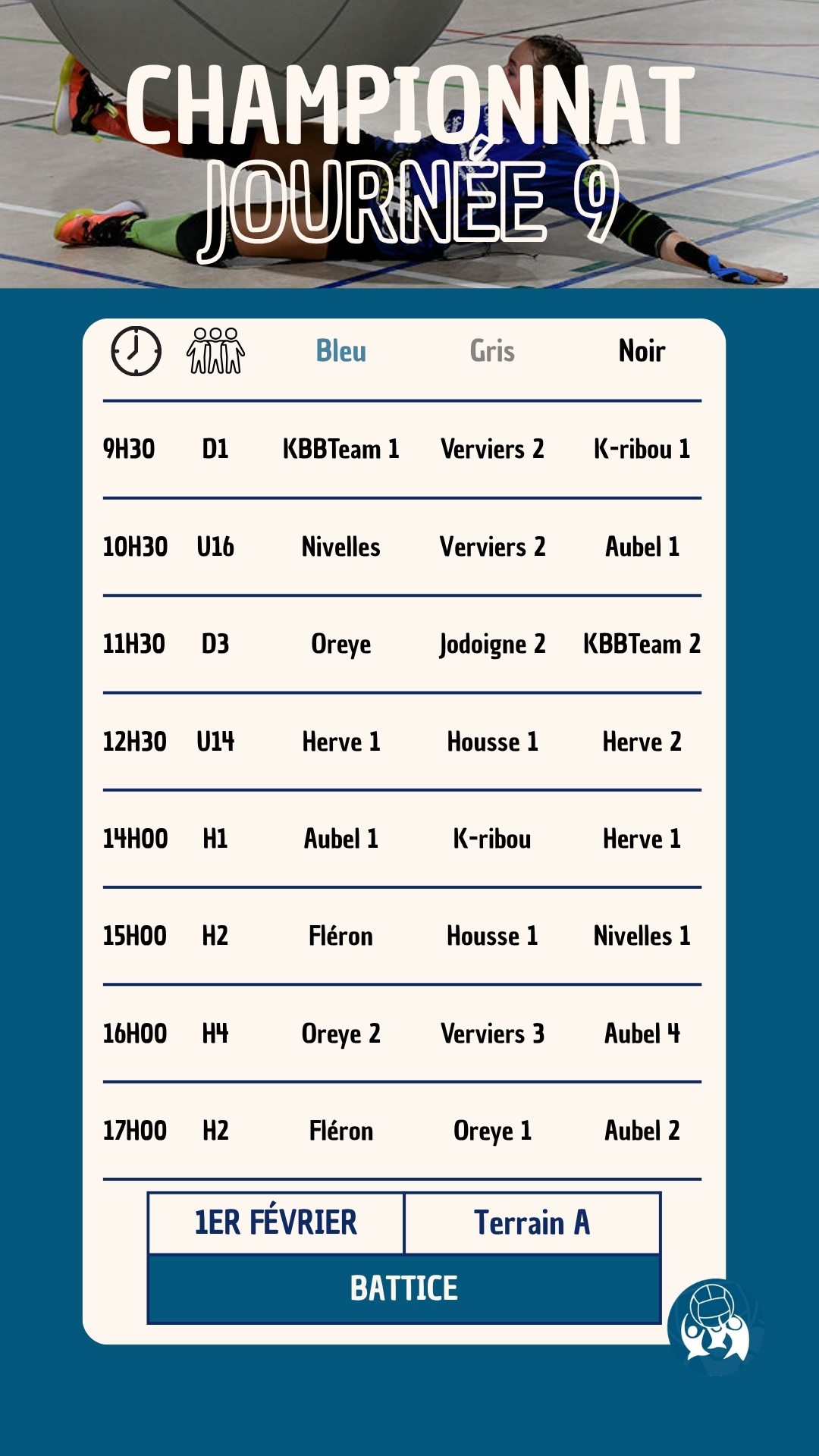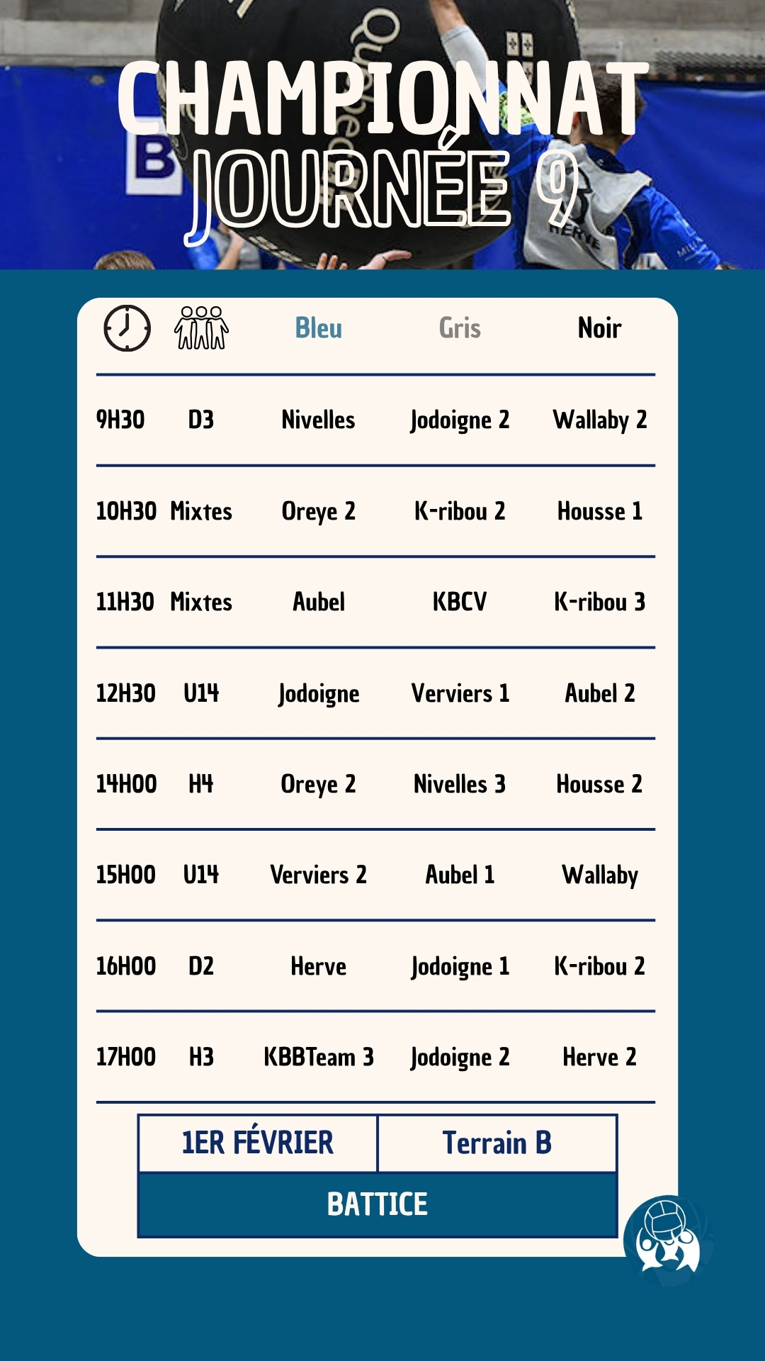 La troisième journée des Play-Offs et les finales du championnat national de la saison 2025-2026 auront lieu le 26 avril 2026 à Battice (Rue Forge-les-eaux, 4651 Battice) . Le club de Kin-Ball de Herve vous accueillera pour l’ultime journée de cette saison.