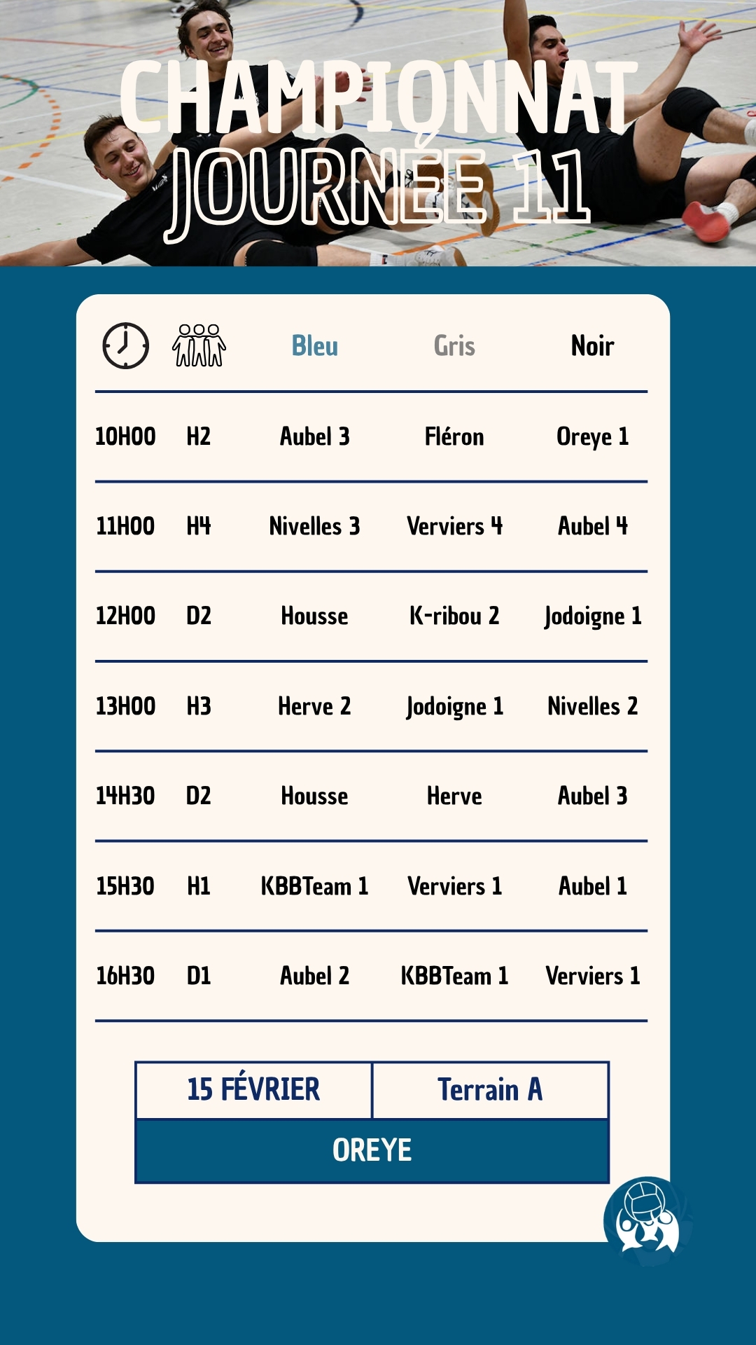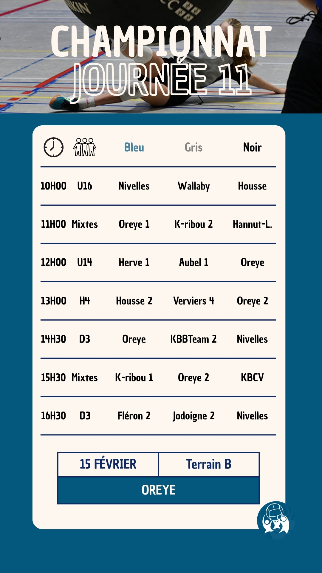 La onzième journée du championnat national de la saison 2025-2026 aura lieu le 15 février 2026 à Oreye (Rue de la cité 18, Oreye). Le club d’Oreye vous accueillera pour une nouvelle journée 100% Kin-Ball.