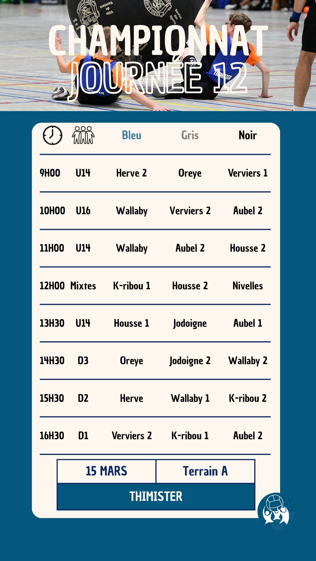 La douzième journée du championnat national de la saison 2025-2026 aura lieu le 15 mars 2026 à Thimister (Rue Cavalier Fonck 15, 4890 Thimister). Le club de Wallaby’Thim vous accueillera pour une nouvelle journée 100% Kin-Ball.
