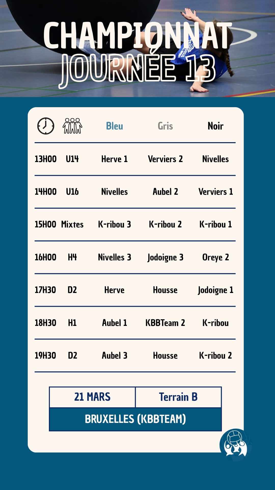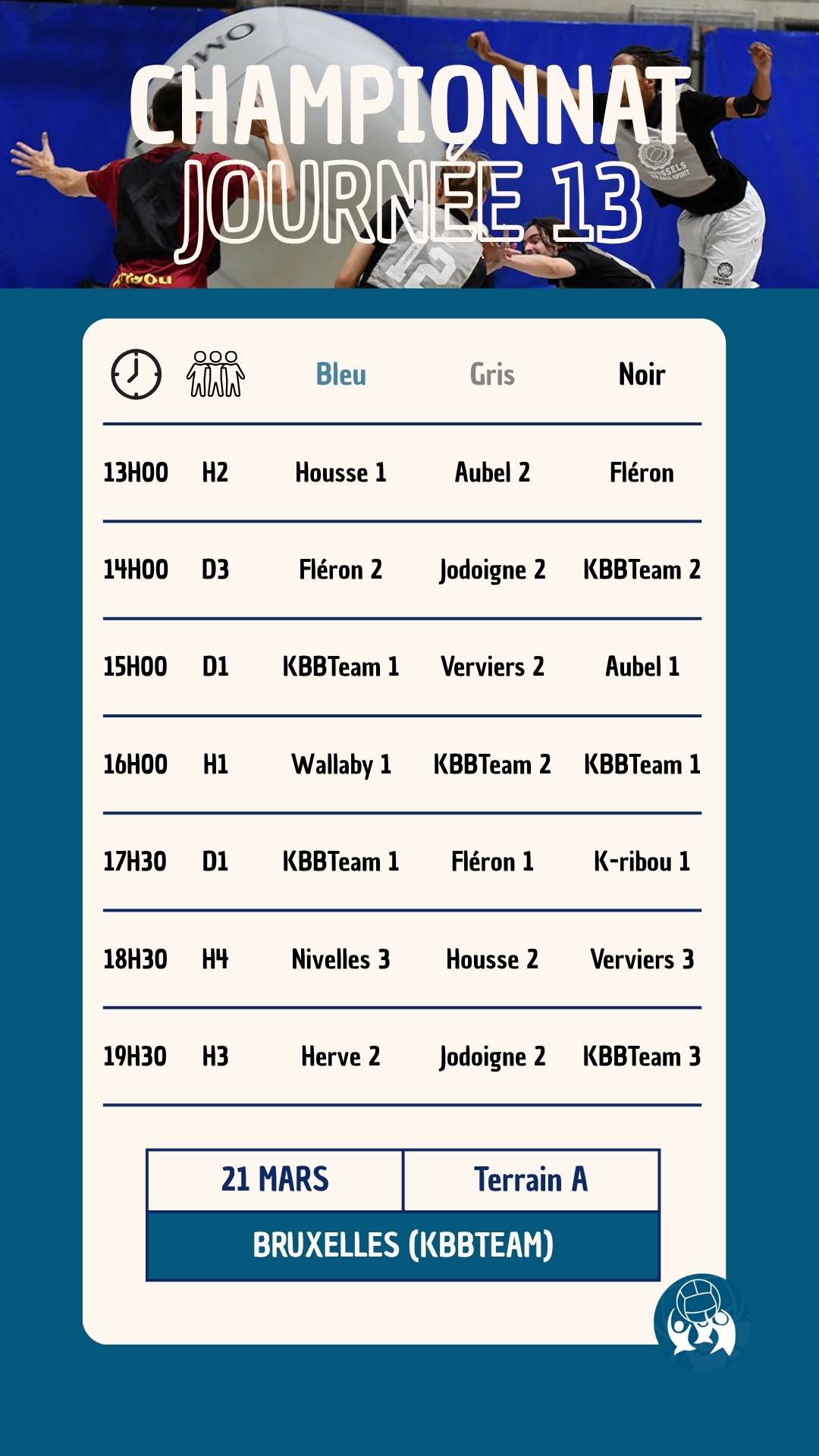 La treizième journée du championnat national de la saison 2025-2026 aura lieu le 21 mars 2026 à Bruxelles (Rue Volta 18, Ixelles). Le club de KBBTeam vous accueillera pour une nouvelle journée 100% Kin-Ball.