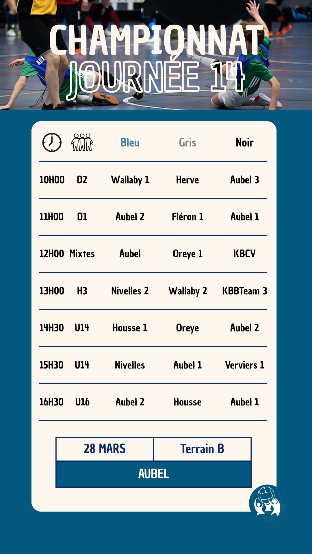 La dernière journée du championnat national de la saison 2025-2026 aura lieu le 28 mars 2026 à Aubel (Ruelle de la Kan, 4880 Aubel). Le club d’Aubel vous accueillera pour une nouvelle journée 100% Kin-Ball.